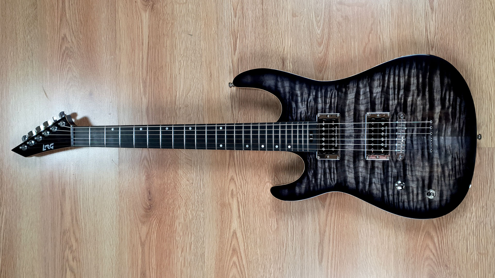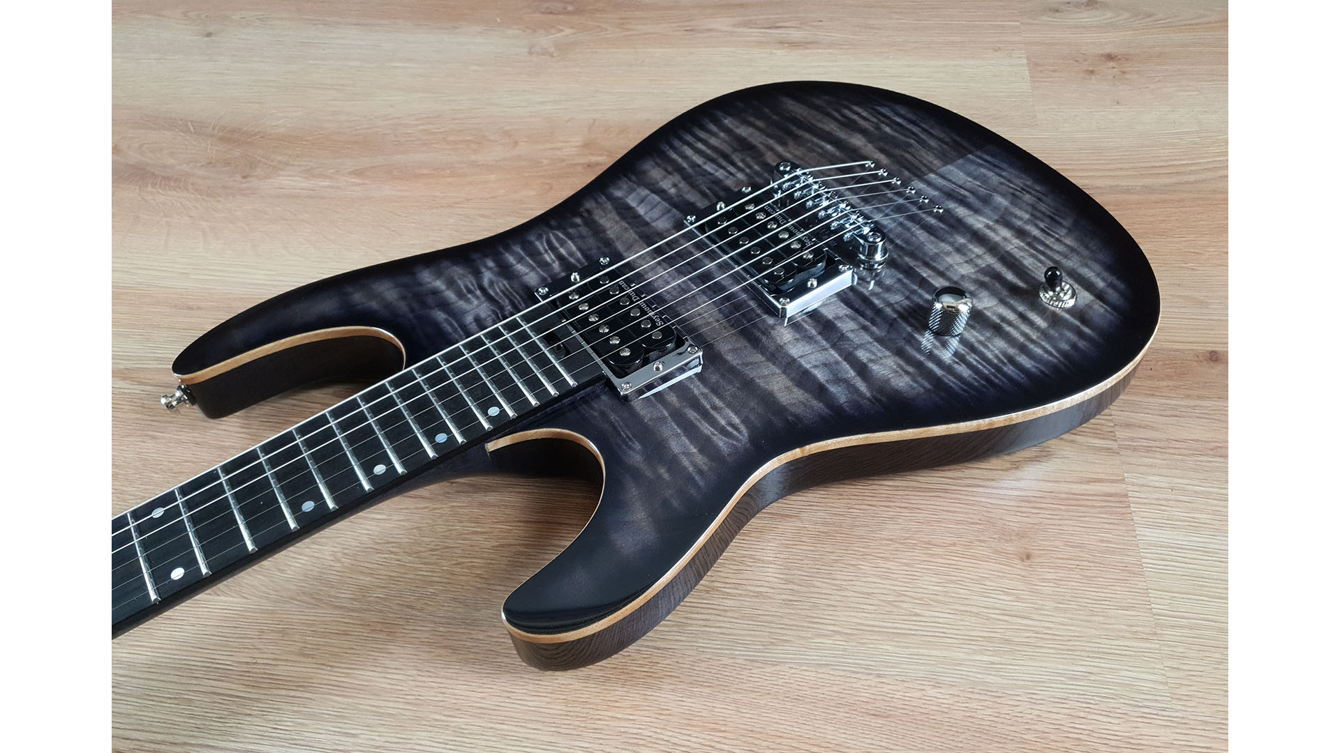 Corps et table en érable ondé, touche en ébène, manche en érable ondé et wengé, micros Seymour Duncan Distortion.