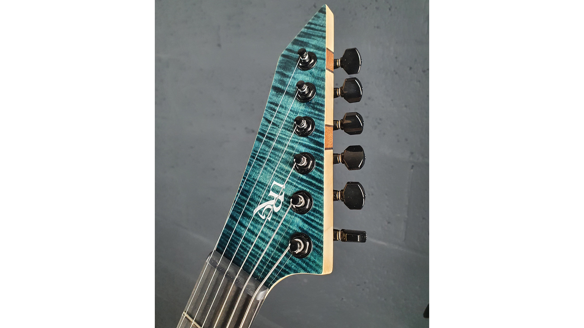 Corps en acajou, table en érable, touche en ébène du Gabon, incrustations en nacre, micros Seymour Duncan Mayhem Distortion.