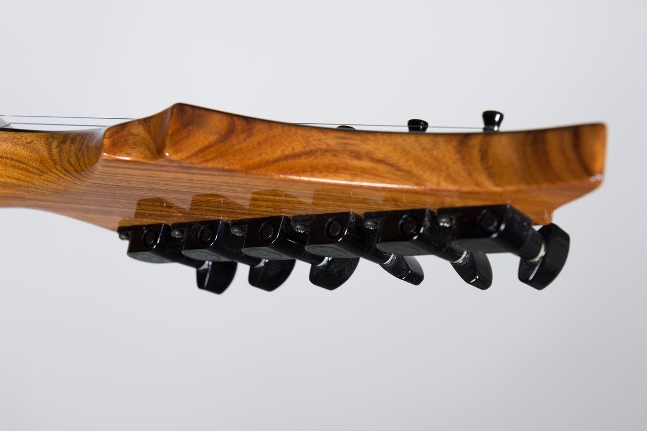 Corps en frêne, manche en palissandre de Santos, touche en padouk avec aubier.
