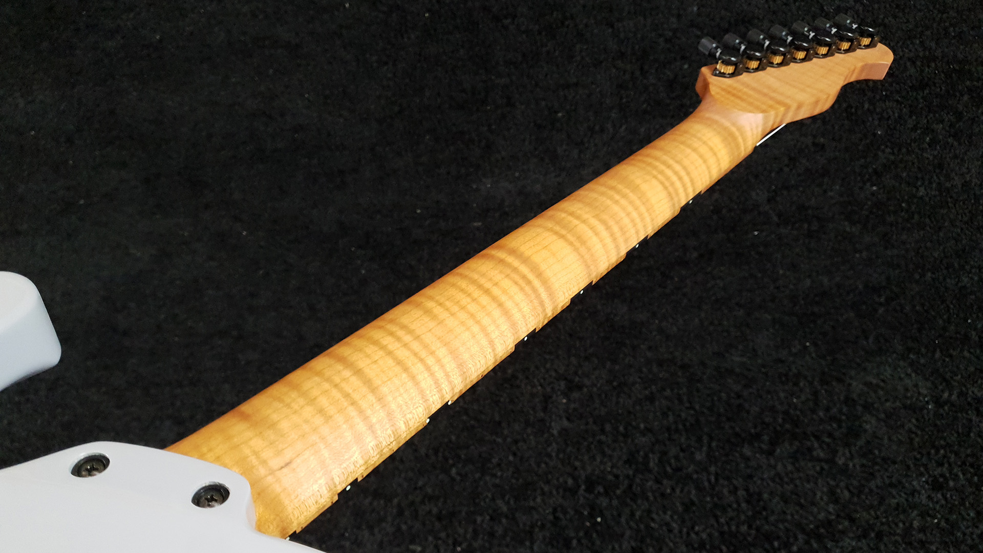 Corps en tilleul, manche et touche en érable ondé torréfié, sillet en coton compressé, micros Bare Knuckle white custom.