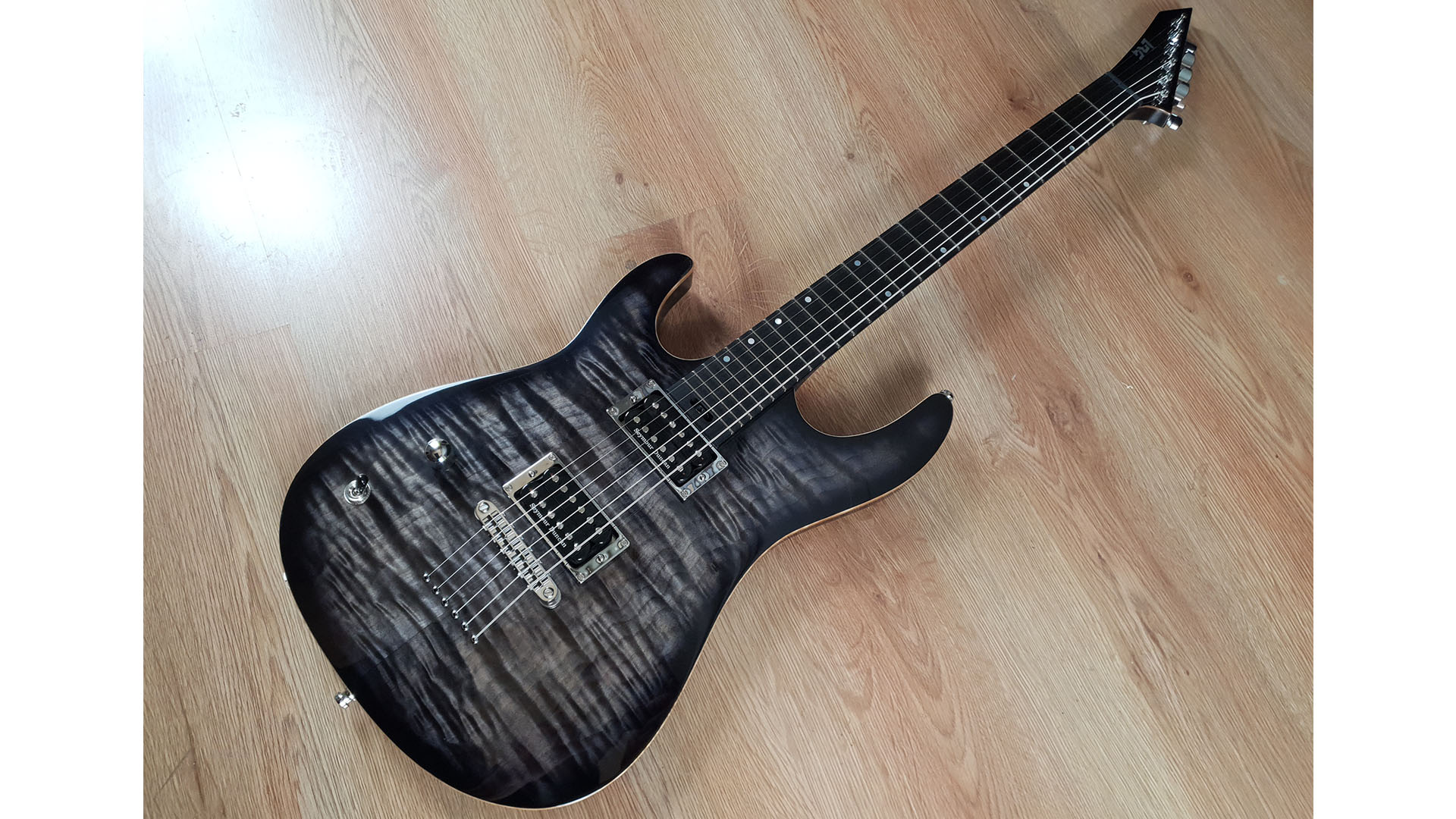 Corps et table en érable ondé, touche en ébène, manche en érable ondé et wengé, micros Seymour Duncan Distortion.